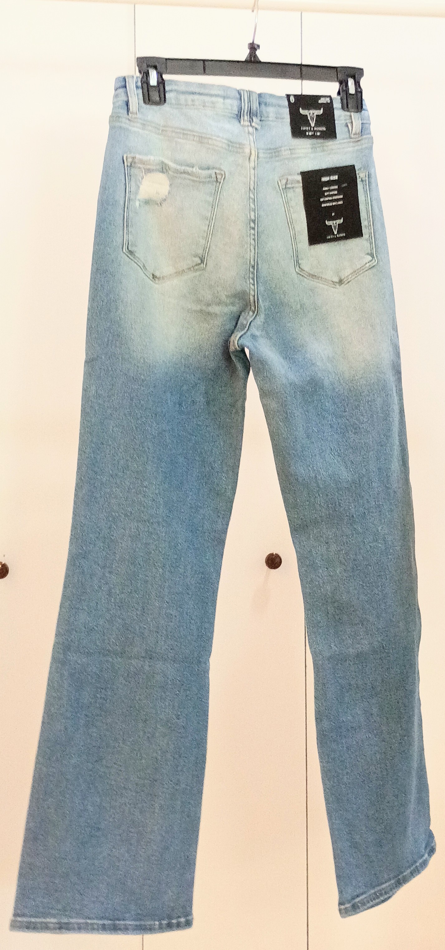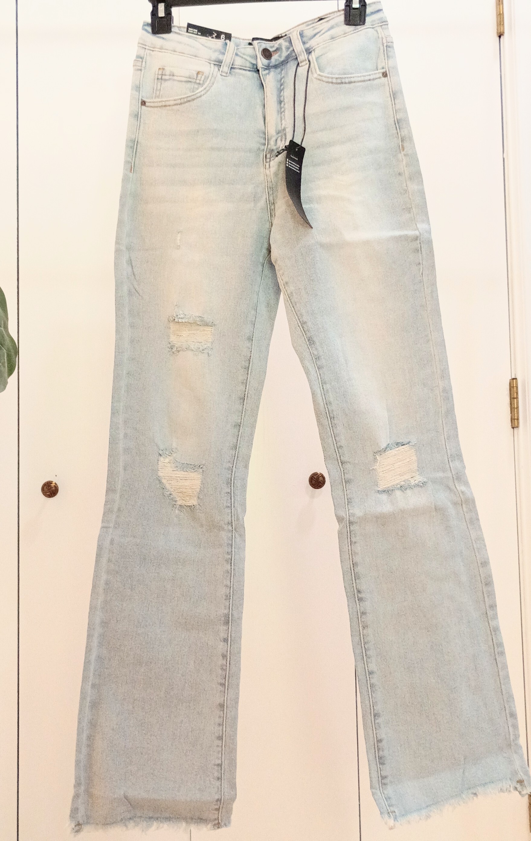 Light wash high rise distressed bootcut jeans (33in inseam)