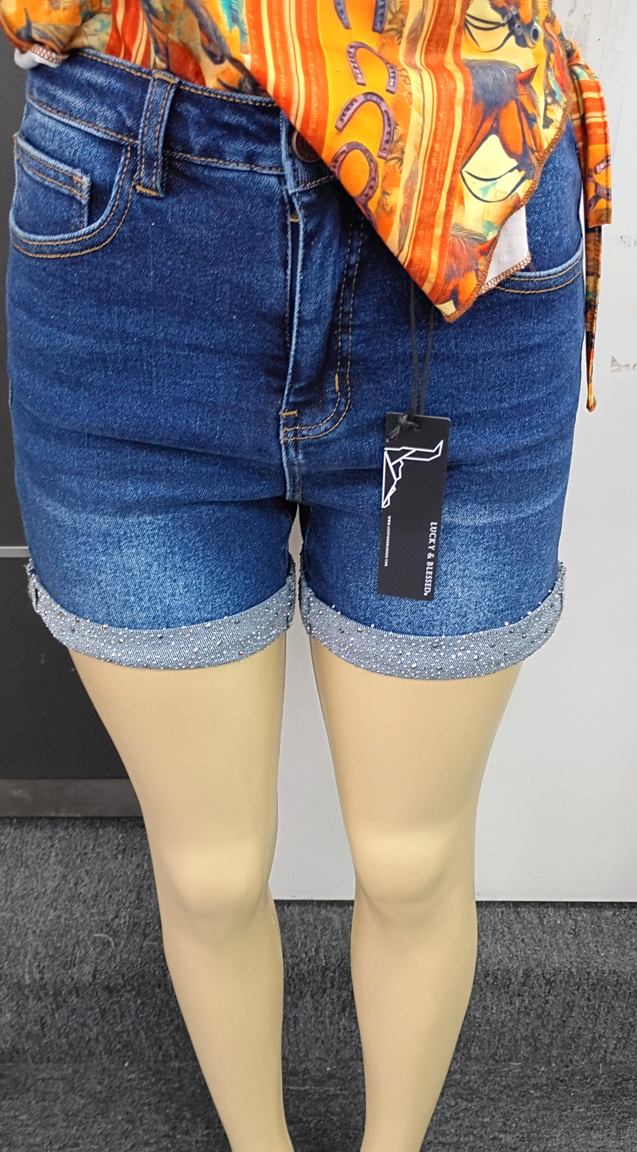 Lucky & Blessed Midwash Rhinestone Cuffed Denim Shorts