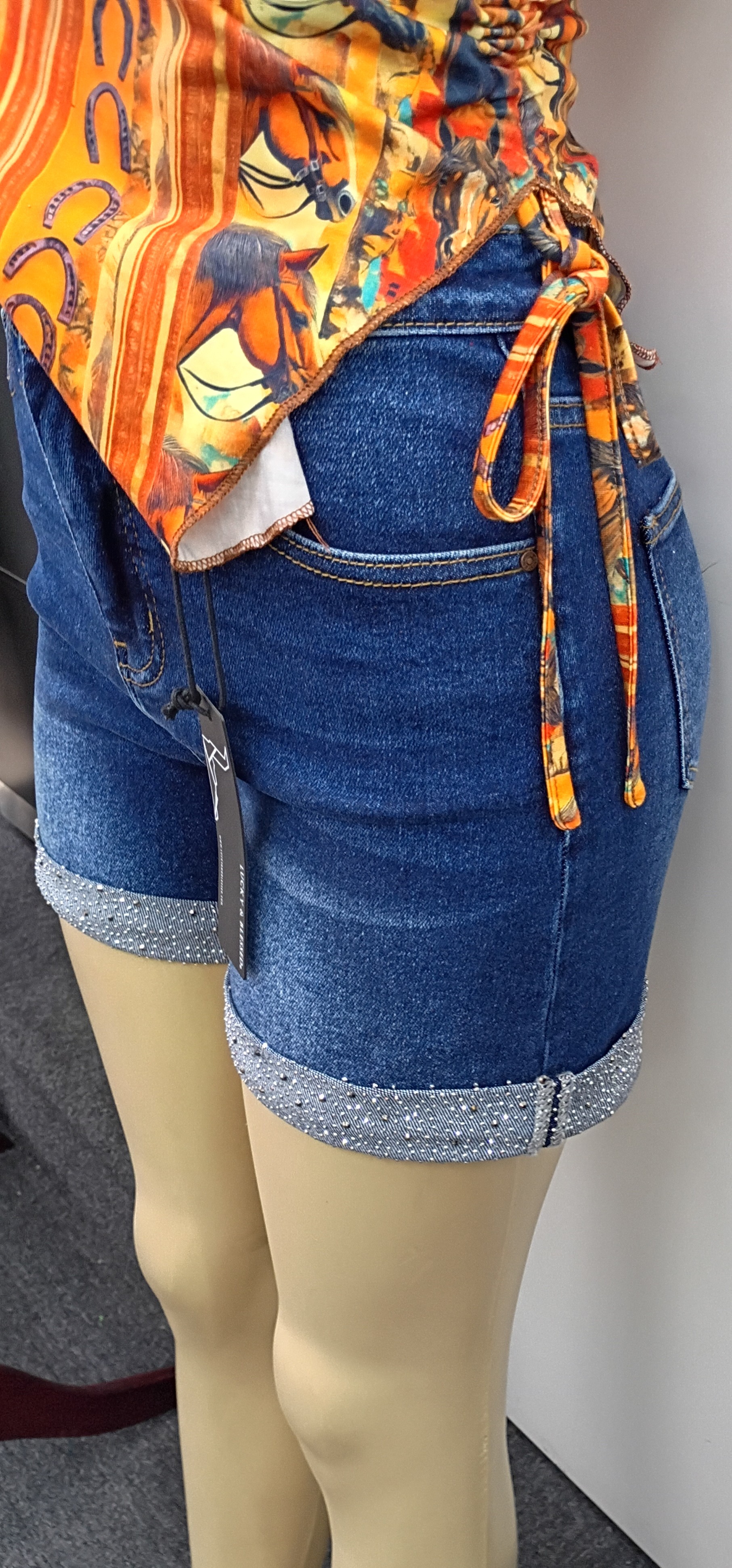 Midwash rhinestone cuffed stretch denim shorts